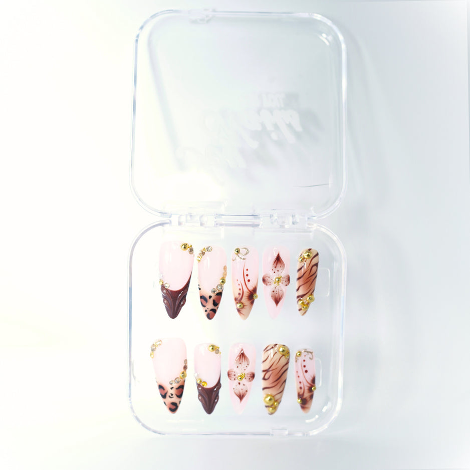 Handgefertigte, wiederverwendbare Kunstnägel aus hochwertigem Soft Gel statt Plastik – stabil, flexibel und optisch wie eine professionelle Modellage. Der Unterschied: Du kannst sie ganz einfach selbst anbringen, egal wo du bist, und das in weniger als 10 Minuten.