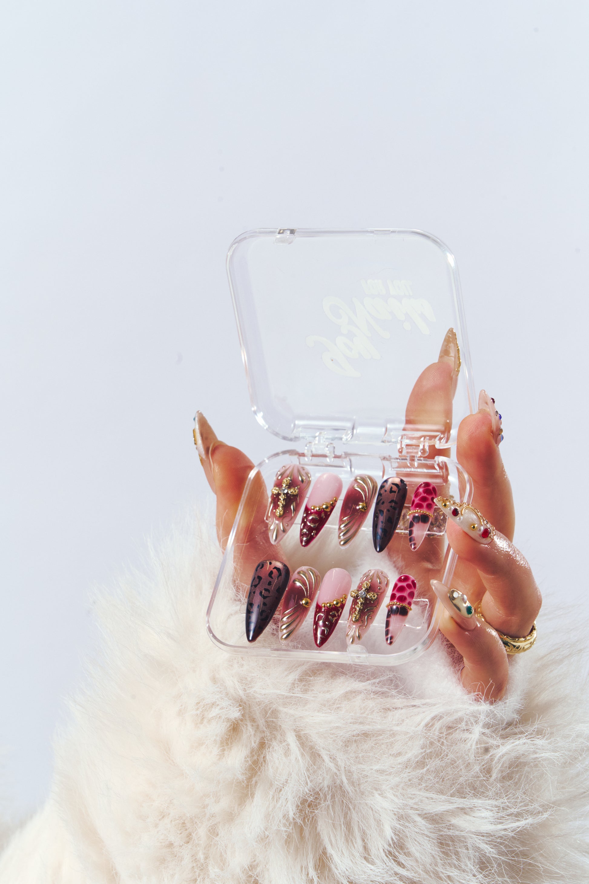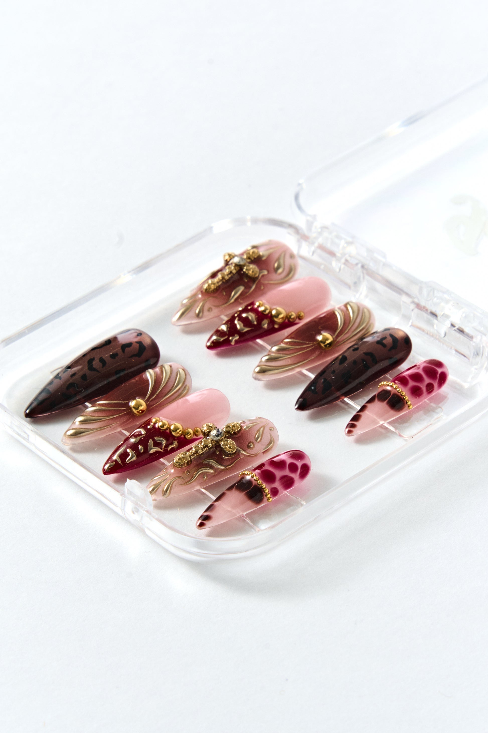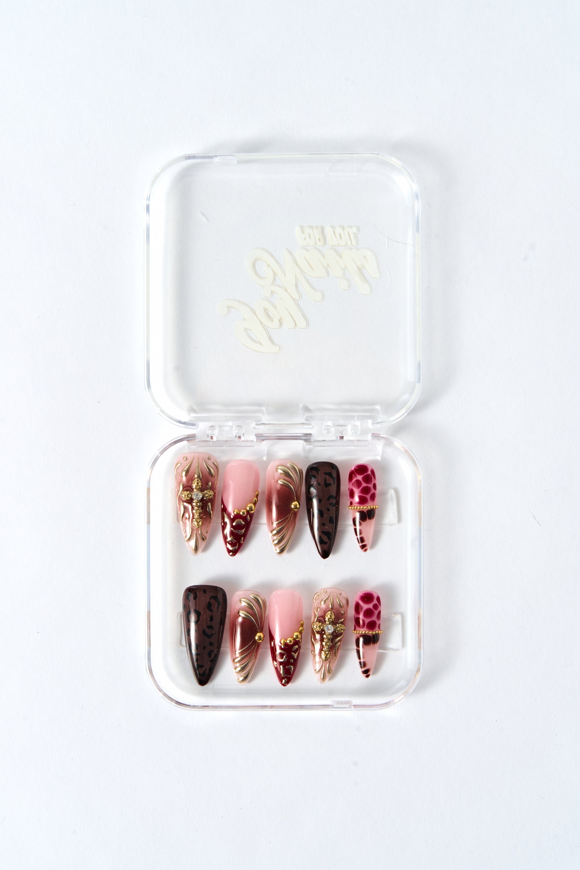 Nude- und Rosé-Töne treffen auf tiefes Bordeaux, veredelt mit goldenen 3D-Ornamenten, Kreuzen und feinen Swirl-Details. Akzente mit Leo- und Spot-Designs sorgen für einen luxuriösen, ausdrucksstarken Look – perfekt für besondere Anlässe oder einfach, um dich selbst zu fühlen.