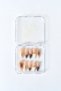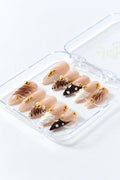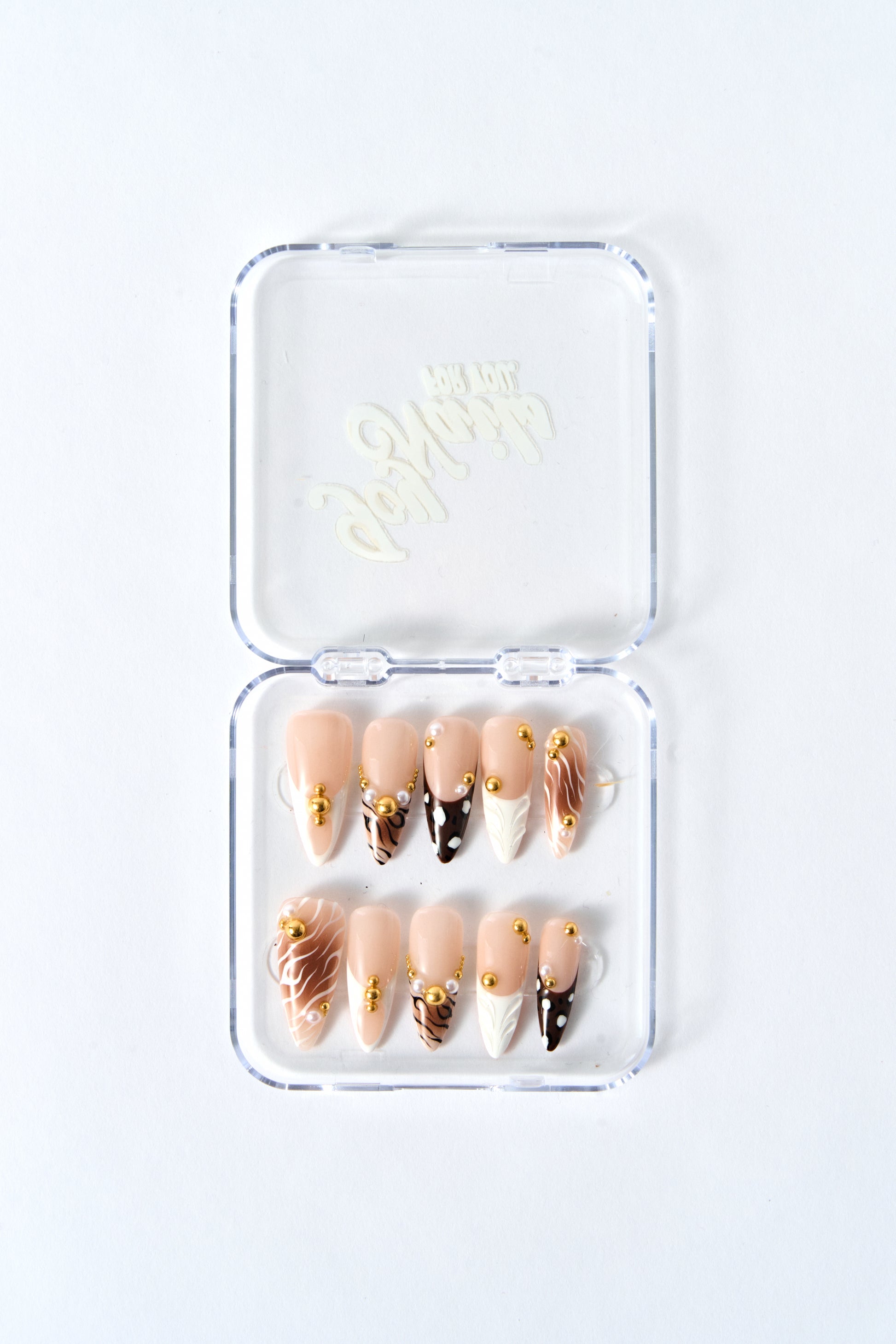 Nude-Basis mit weißen Swirls, warmen Braun-Akzenten und trendigen Animal-Prints. Veredelt mit goldenen Perlen für einen edlen, modernen Look – perfekt für besondere Anlässe oder einfach, um dich selbst zu fühlen.